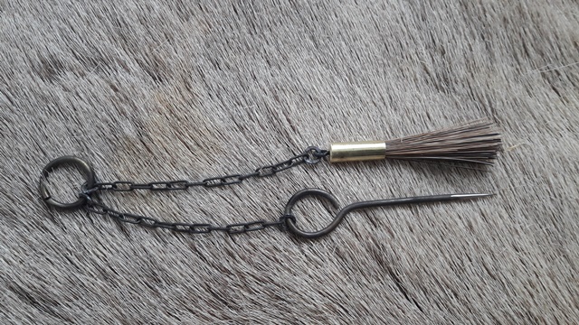 Vorderlader Reinigungs Set für Steinschloss Waffen, Pfannenbürste und Zündlochnadel, hangeschmiedet, Bürste aus Keiler-Kurzwildbret, Nadel cca 11 cm lang, Gesamtlange cca 20 cm. / Cleaning set for flintlock guns, pan brush from wild boar bristles, handforged vent pick cca 1 cm long, total lenght ca 20 cm.