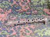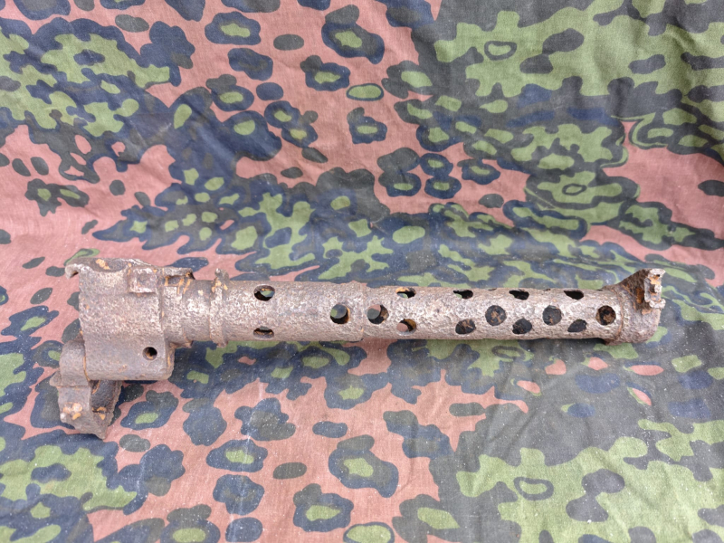 Das Teil befindet sich in starkem Relikt-/Bodenzustand mit erheblicher Korrosion, Lochfraß, Oxidation und deutlichem Materialverlust. Ein Ende ist abgebrochen und unregelmäßig, was auf lange Bodenlagerung oder Gefechtsschäden hindeutet. Die charakteristischen Kühlöffnungen sind entlang der Länge klar erkennbar und bestätigen das typische MG34-Fertigungsmuster.