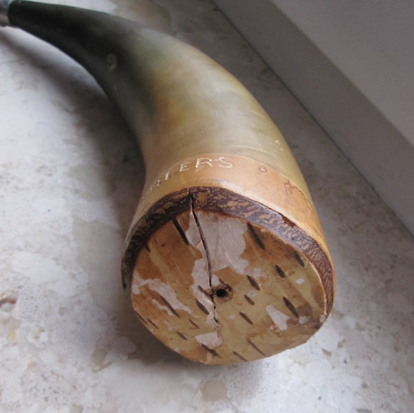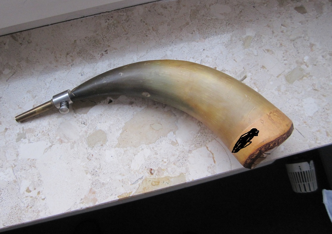 Angeboten wird hier von Privat ein gebrauchtes Pulverhorn. Aus Horn gefertigt mit Birkenholzabschluß. Der Birkenholzabschluß hat einen Riß und ein Loch. Beides ist wohl nicht durchgehend. Im Loch war wohl mal eine Messing Zierteil eingesetzt. Den Riß kann man aber selbst leicht verschließen. Gesamtlänge 29 cm. Auf dem Horn ist eine Name eingraviert.+++++++++++++