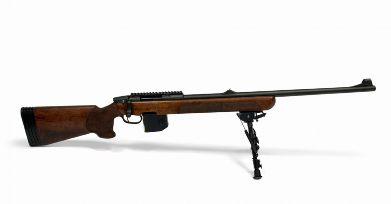 Der 26 Zoll lange Lauf ist mit einer festen Visierung ausgestattet, die aus einem schrägen Kimmenblatt mit eingelegtem Kontrastdreieck und einer verstellbaren Kornkappe unter einem Schiebeabdeckung besteht. Alle Metallteile sind in mattem Anthrazitgrau brüniert. Der beidhändig verwendbare 14"-LOP-Schaft, der für präzises Schießen optimiert ist, besteht aus ausgezeichnetem europäischem Walnussholz mit feiner Maserung und verfügt über eine mehrteilige Schaftkappe aus Verbundmaterial, mit der die Länge eingestellt werden kann.