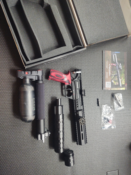 Leshiy 2 in .22 with 350mm barrel, REPR regulator. 350cc bottle (8/22 manufacture date), pic rail handguard, Edgun Behemoth 4-section moderator with an extra baffle, Tri-lug QD. 2 mags with two extra backing plates, M-lok mag holder, REPR adjustment/disassembly tool, extra pucks and orings, fill probe, box, and manual.