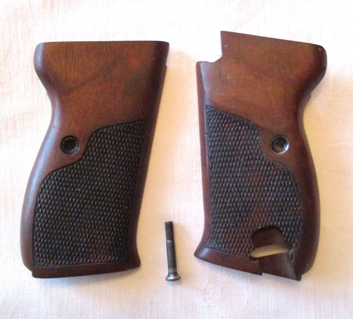 ORIGINAL Nussbaum- Holzgriffschalen für eine Pistole WALTHER P38 oder P1. Mit Schraube. Recht selten. Guter Zustand.
