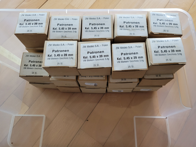 Hallo, ich biete euch 725 Schuss 5,45x39 von Mesko, Stahlhülse mit Bleikerngeschoss. Ich verkaufe nur an Selbstabholer ! ! !