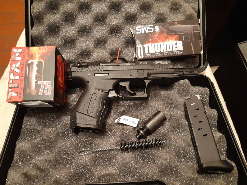 Verkaufe eine Gas-Signal Pistole von Walther. Modell: P22 brüniert Kaliber: 9mm P.A.K. Magazin: 1 Zubehör: Abschussbecher für Signalmunition, Reinigungsbürste und original Waffenköffer vorhanden und wird mitgesandt. Neupreis der Waffe 159,90 €. Mit der Waffe wurden an Sylvester, auf privatem Grundstück, 5 Schuss abgegeben. Abgabe/Verkauf erst ab 18 Jahren. Bei Abholung gibt es noch 50 + 70 (75-5) Schuss 9 mm P.A.K Munition dazu. Abgabe nur mit Altersnachweis! Ich weise darauf hin, dass diese Waffe nicht in der Öffentlichkeit ohne einen kleinen Waffenschein geführt werden darf. In Waffenverbotszonen ist sie natürlich auch verboten! Altersnachweis erforderlich!!!