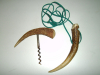 Pfeife aus einer gebogenen Abwurfstange aus Hirschhorn hergestellt und mit einer grünen Kordel um den Hals zu tragen. Größe 15 cm. Zum Zweiten ein Korkenzieher ebenfalls aus Hirschhorn.