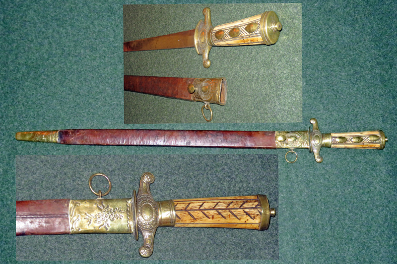 Die Scheide hat einen mit braunen Leder überzogenen Holzkern mit verzierten Messingbeschlägen, der Obere mit Tragehaken und Ring.