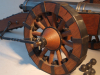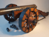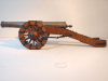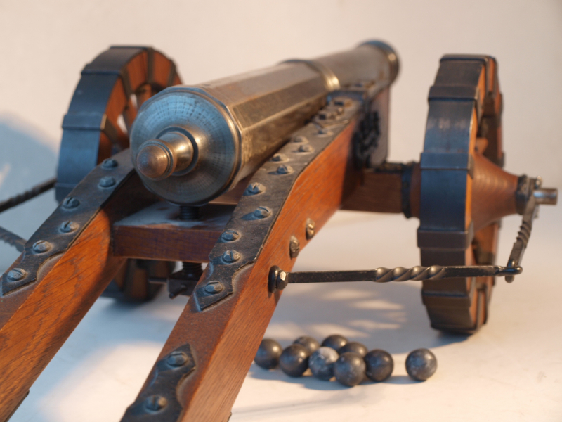 Es ist die Zeit um 1550, Spät-Renaissance oder Früh-Barock genannt. In der für diese Zeit typischen, ausgesprochen langgestreckten Bauweise erscheint dieses Modell einer Feldkanone aus eben dieser Zeit. Kanonen dieser Art wurden auch Kartaunen genannt. Die Kartaune ist ein Vorderlader-Geschütz aus der Zeit des 15./16. Jahrhunderts. Der Begriff Kartaune ist eine Eindeutschung von italienisch quartana bombarda ‚Viertelbüchse‘. Das hier angebotene, ausgesprochen meisterhaft gefertigtes 70 cm lange Modell ist kein serielles Massenprodukt, sondern als Unikat durch die Hände eines versierten Büchsenmachers gefertigt worden. Dies wird nicht nur an der äußerst präzisen, langgestreckten Wangenlafette, den extrem aufwändig gefertigte Speichenrädern und den schönen Beschlagelementen klar, sondern auch an dem, aus einem Stahlstück erstellten 46 cm langen Kanonenrohr deutlich. Das Rohr verfügt selbstverständlich über einen sauberen Lauf und ein, sich auf 2,5 mm verjüngendes Zündloch. Das schön patinierte Rohr weist den Beschussstempel des Beschussamtes in Ulm auf. Zwischen den Schildzapfen ist das Cal. 14 mm eingeschlagen. Das gesamte Modell ist in allen Details und in seiner Gesamtheit ausgesprochen präzise und äußerst maßstabsgerecht.angefertigt. Es dürfte aus dem 1. Viertel des letzten Jahrhunderts stammen und ist damit als historisch anzusprechen. Es ist ein einzigartiges und wunderschönes Modell einer Feldkanone aus einer frühen und wenig dargestellten Zeit. Da das Rohr offiziell staatlich beschossen ist, findet ein Verkauf nur an volljährige Personen statt.