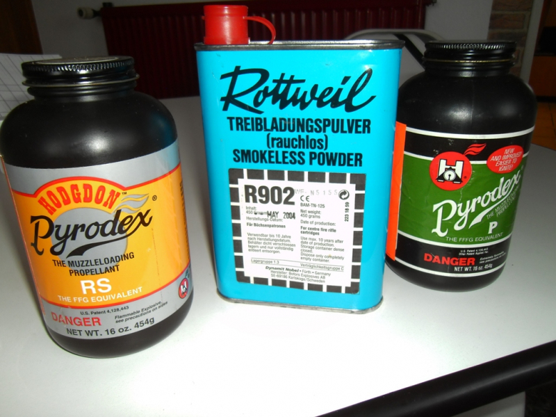 3 leere Behältnisse, 2 unterschiedliche Pyrodex Kunststoffcontainer in schwarz und 1 Rottweil Treibladungspulver in Blechgebinde. Alles leer ohne gefährliche Stoffe.