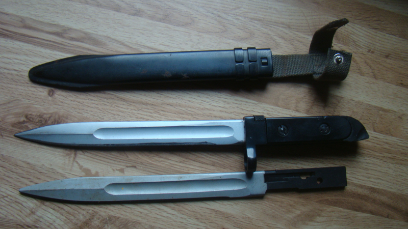Bajonett wohl für zivile Nutzung abgeändert: Saubere jedoch geschärfte Klinge, mit 2. ungeschärfter Ersatzklinge, Gewheraufschubbacken entfernt, nicht mehr auf Gewehr aufpflanzbar - warum auch immer ?!?