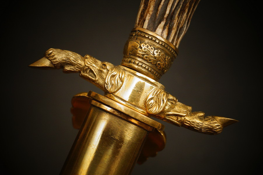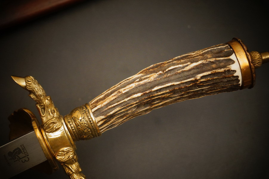 Fundzustand. Stahlklinge mit Ätzung und Hersteller Eickhorn um 1940. Privates, jagdliches Stück mit echtem Hirschhorn. Bronzebeschlagteile.