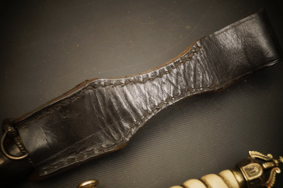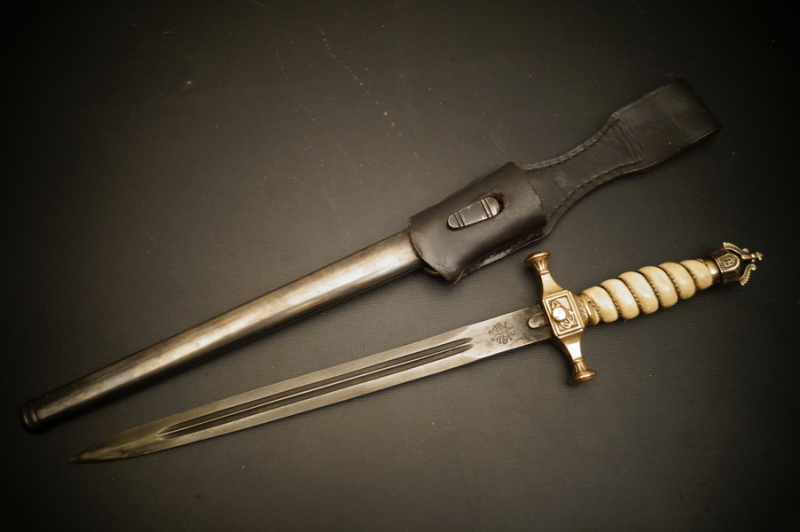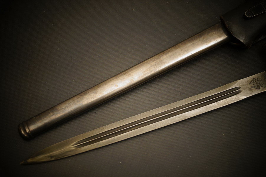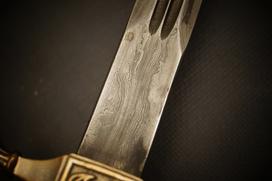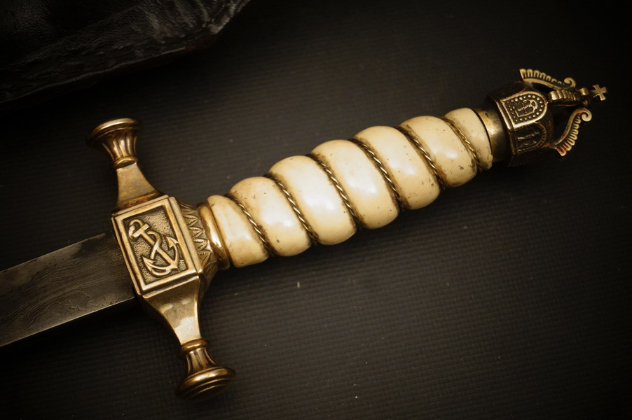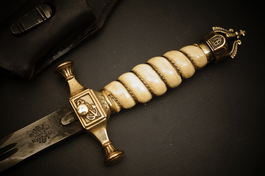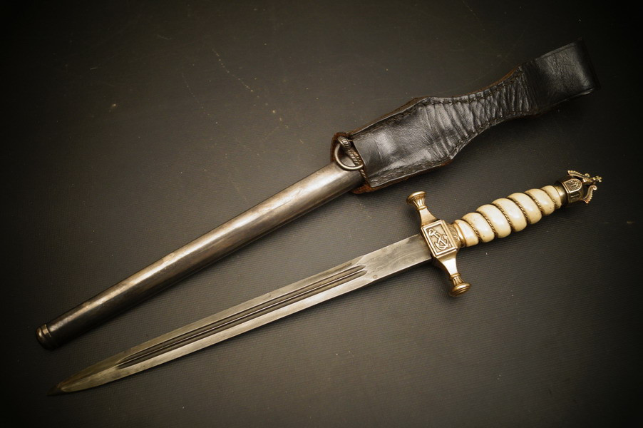 Fundzustand. Reichsmarine Dolch in der Ausführung von 1919 jedoch mit Damast Klinge von Eickhorn und der Montur bis 1918 mit mehrteiliger Kaiserkrone. So aus Sammlung wie alles andere. Unangetastet.