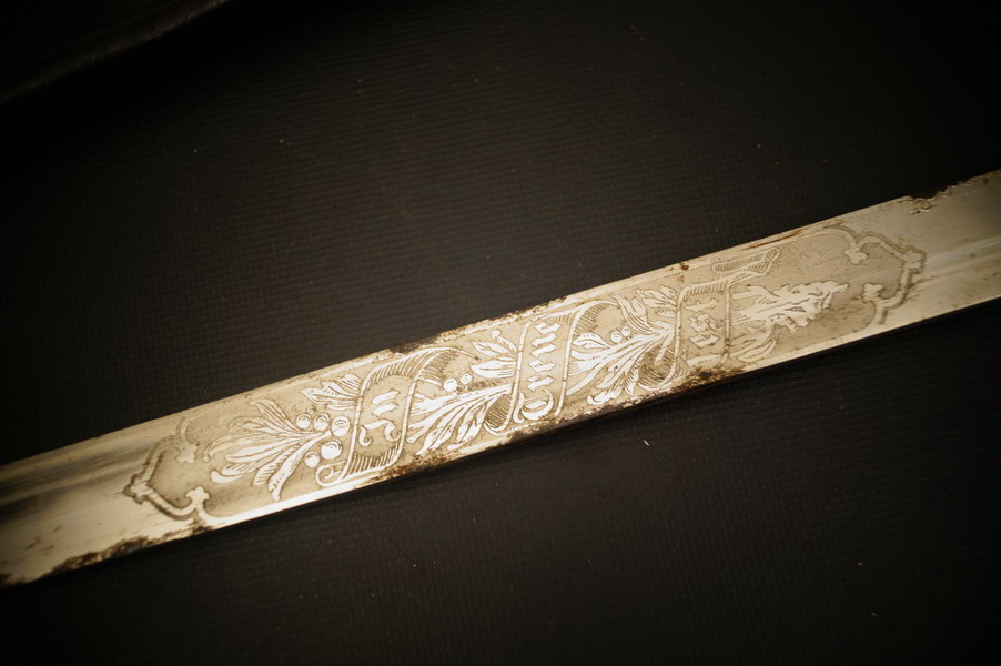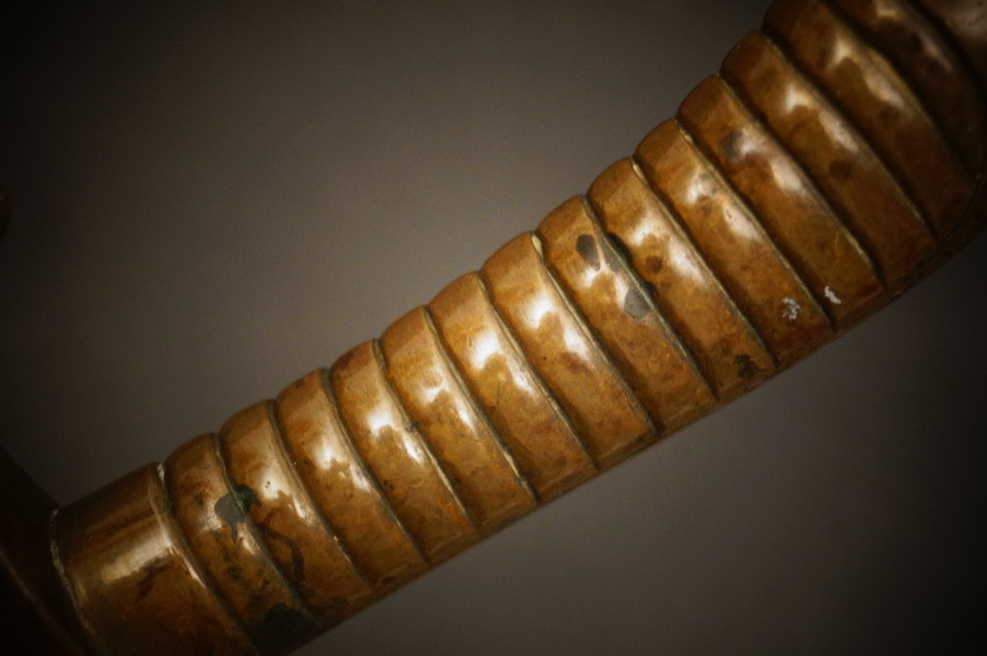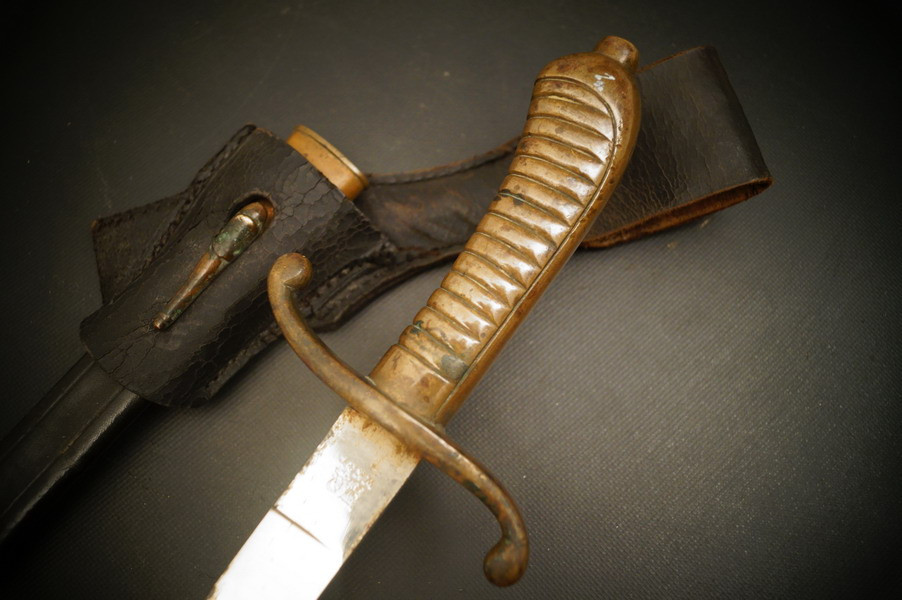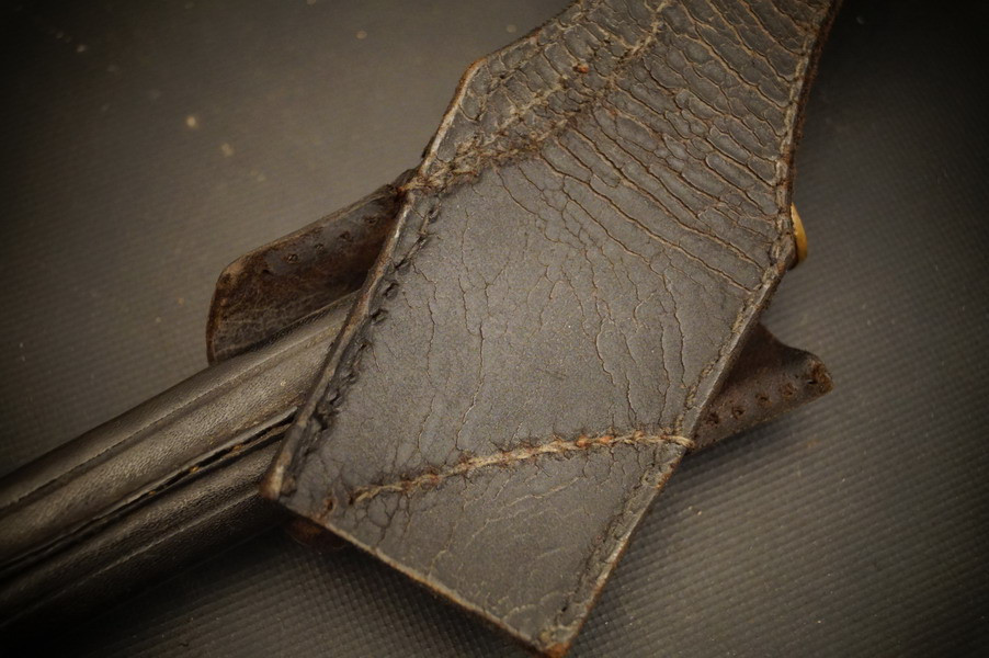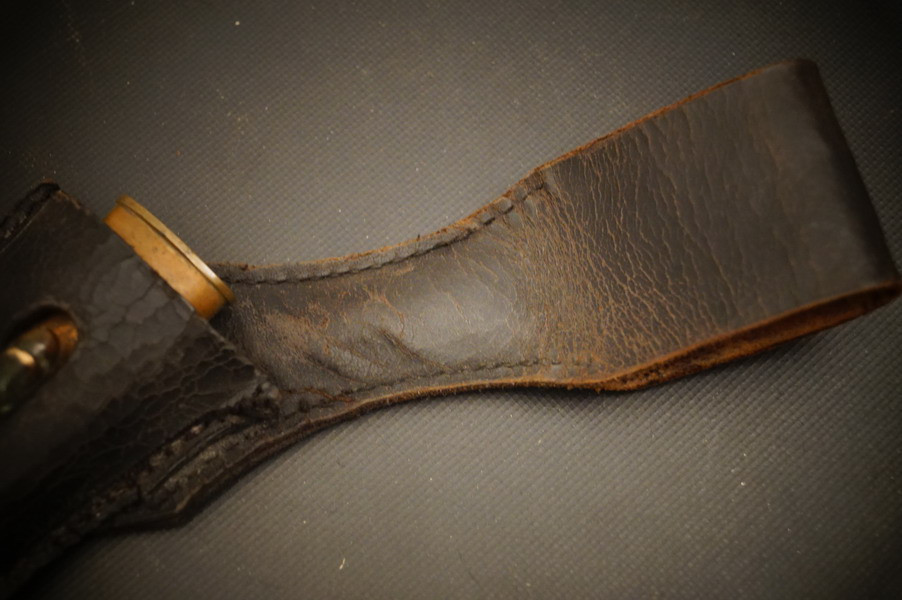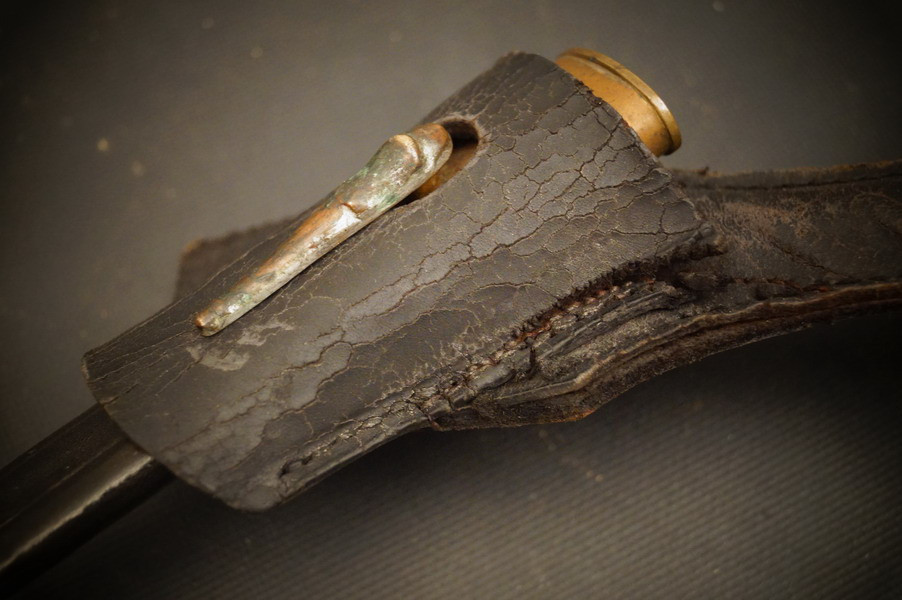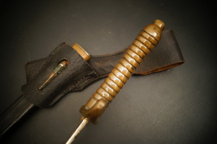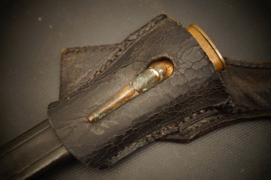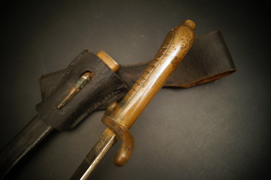 Fundzustand. Bronzegefäß und Stahlklinge mit Hersteller und Ätzung beidseitig. Koppelschuh zeitgenössich umgebaut ! Lederscheide ist dazugehörig aber die Klinge geht nicht ganz rein - ich wollte nichts mit Gewalt machen.