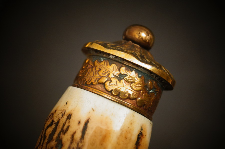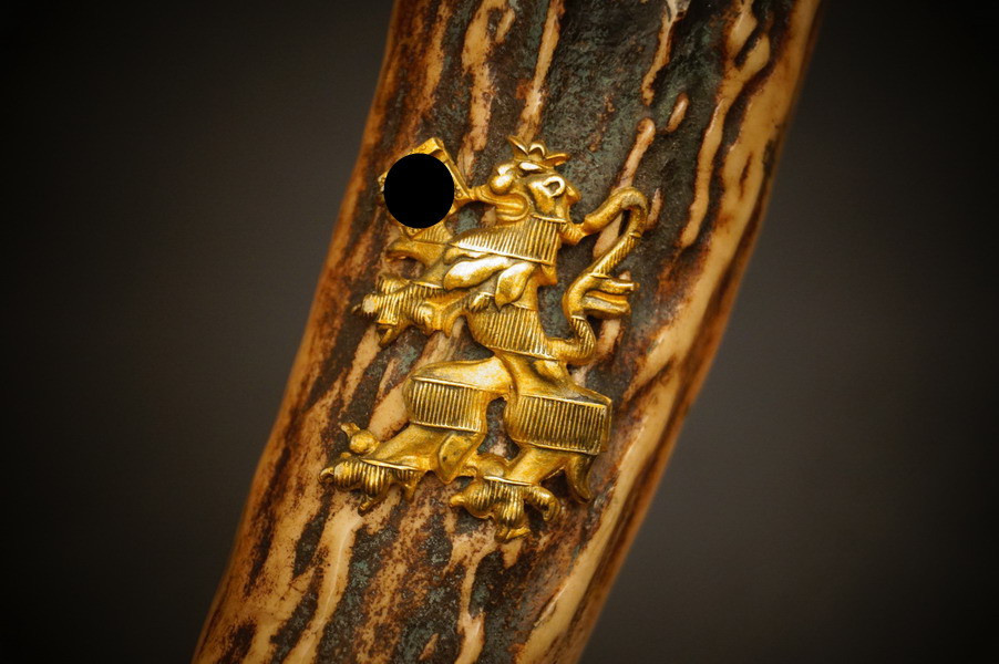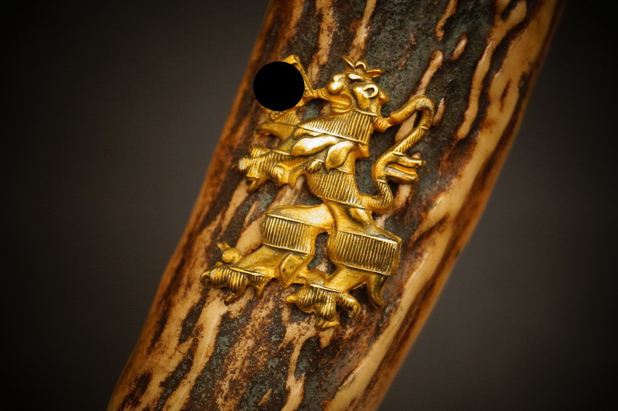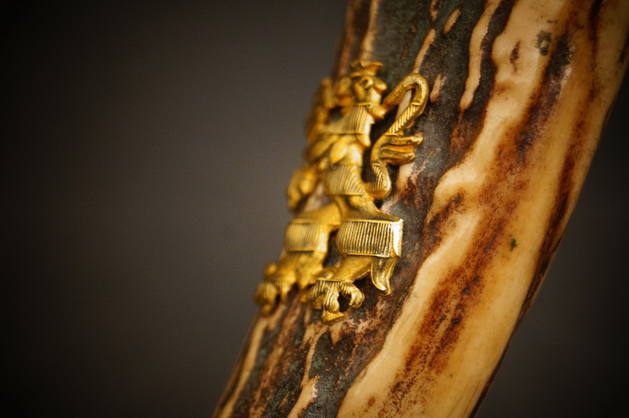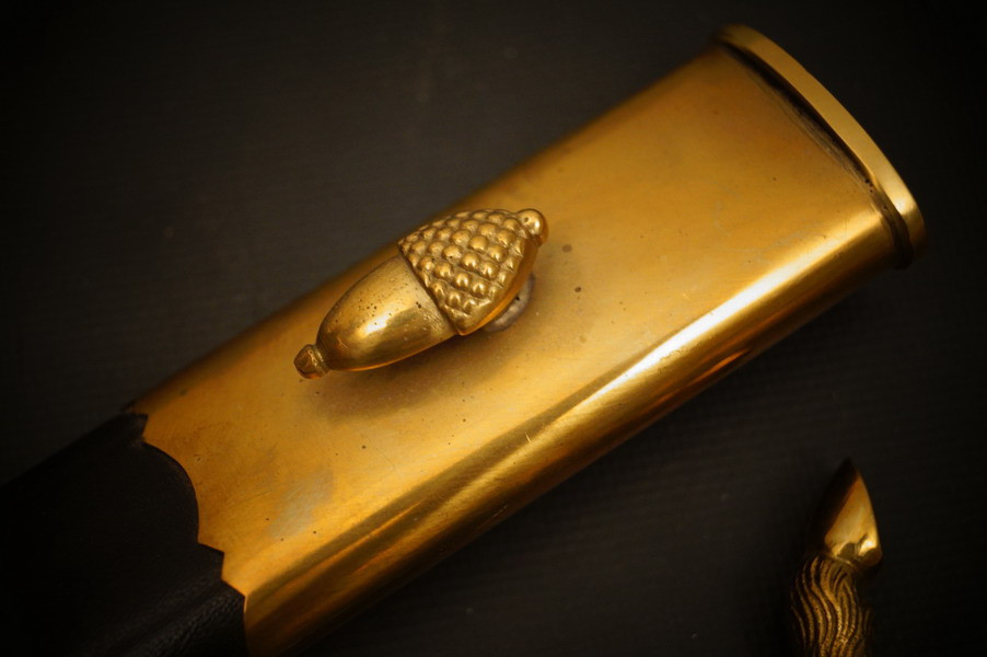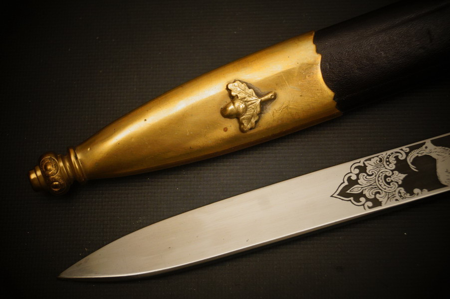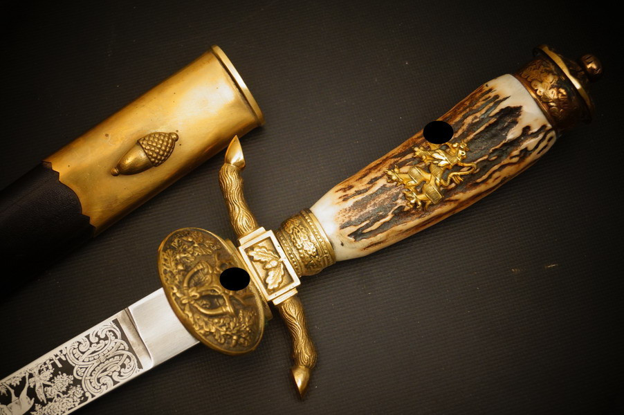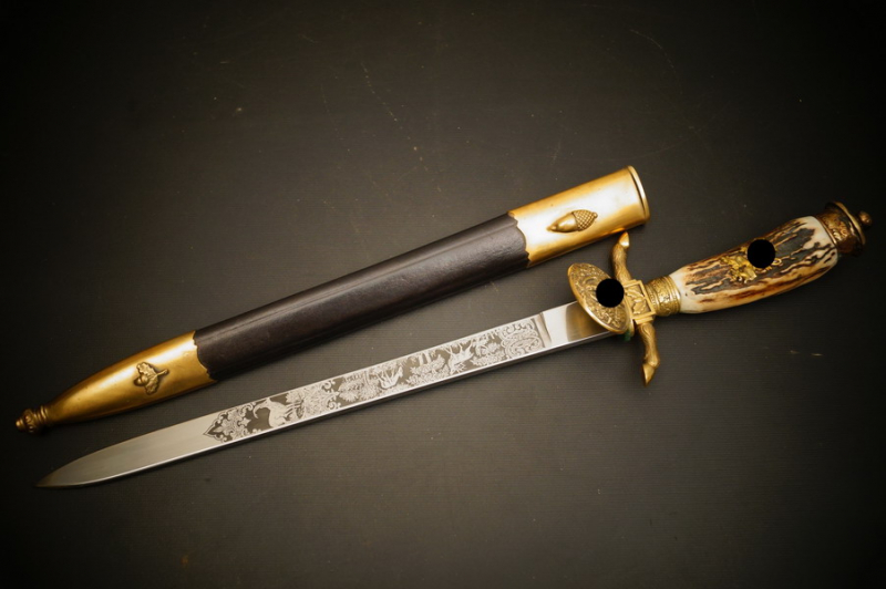 Fundzustand. Lederscheide mit vergoldeten Beschlagteilen. Klinge mit dreifacher Ätzung und Hersteller Ernst Pack & Söhne Solingen. Echthorn-Griffstück mit Bayern WK2 Auflage mit HK. Beschlagteile aus Bronze, vergoldet. Seltenes Stück !