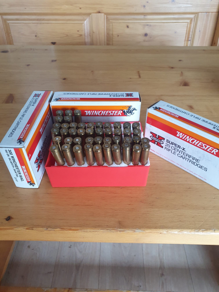 Angeboten werden zwei vollständige Päckchen (a 20 Schuss) im Kaliber .300 Winchester Magnum der Firma Winchester mit Geschossgewicht 190grs sowie in der dritten Packungen fünf Schuss derselben Munition.