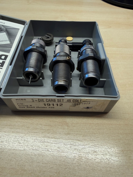 Verkaufe einen RCBS Matrizensatz für Kaliber .45 Long Colt. Zustand siehe Bild, den Hülsenhalter gibt es auch dazu.