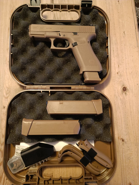 Das bewährte Crossover-Modell kombiniert den kompakten Verschluss der Glock 19 mit dem Full-Size-Griffstück der Glock 17. Ausgestattet ist die Pistole mit dem Glock Marksman Barrel (GMB) für verbesserte Präzision, beidseitigem Verschlussfanghebel sowie der widerstandsfähigen nPVD-Beschichtung in Coyote.