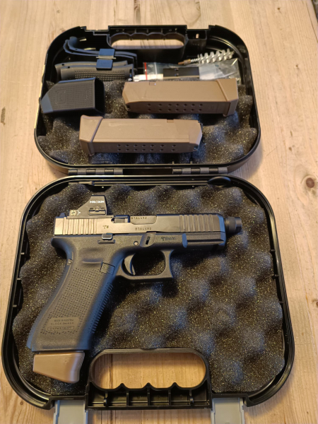 Die Pistole verfügt über das bewährte Compact-Crossover-Design (G17-Griffstück / G19-Verschluss) sowie das MOS-System zur Aufnahme von Optiken. Montiert ist ein Holosun HS507K X2 mit wahlweise 2 MOA Punkt oder 32 MOA Kreisabsehen (umschaltbar).