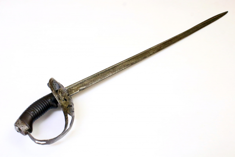 Eisernes, wohl vormals vernickeltes Korbgefäß. Dekoriert mit dem reliefierten Wappen bzw. Hoheitszeichen des Königreichs Württemberg. Parierlappen mit Truppenstempel "25.D.R.". (Drag. Reg. "Königin Olga" 1. Württembergisches Nr.25). Das Gefäß mit konservierender Patina über Korrosionsansätzen, Korrosionsnarben. Der Korb unvollständig, zum Wappen gespalten. Die Griffhilze aus Kautschuk. Das Gefäß gereinigt und konserviert.