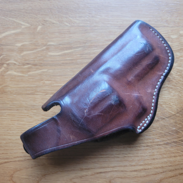 Gebrauchtes Holster des bekannten Herstellers Bianchi für Revolver (Colt oder baugleiche) mit 2,5" Lauflänge. Gebrauchter Zustand, Nähte sind in Ordnung, Druckknopf vom thumb snap funktioniert gut, Eintragephase für das Holster entfällt, da bereits in Gebrauch gewesen.