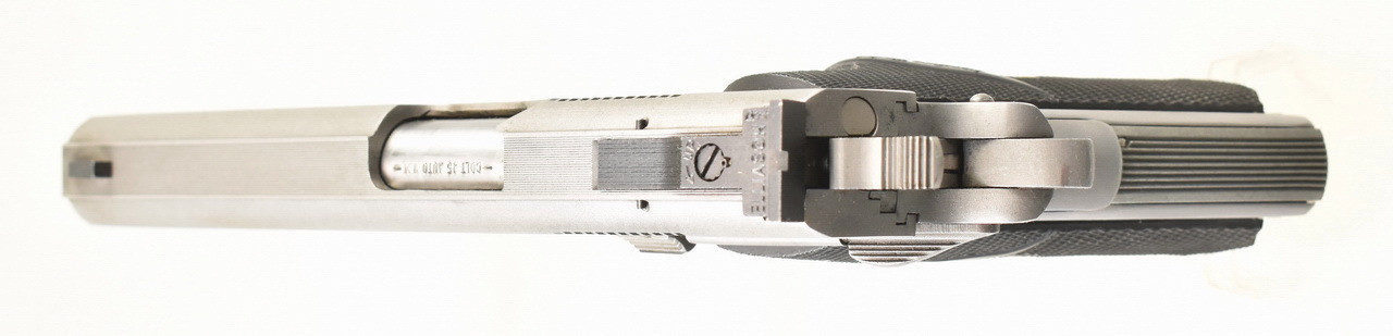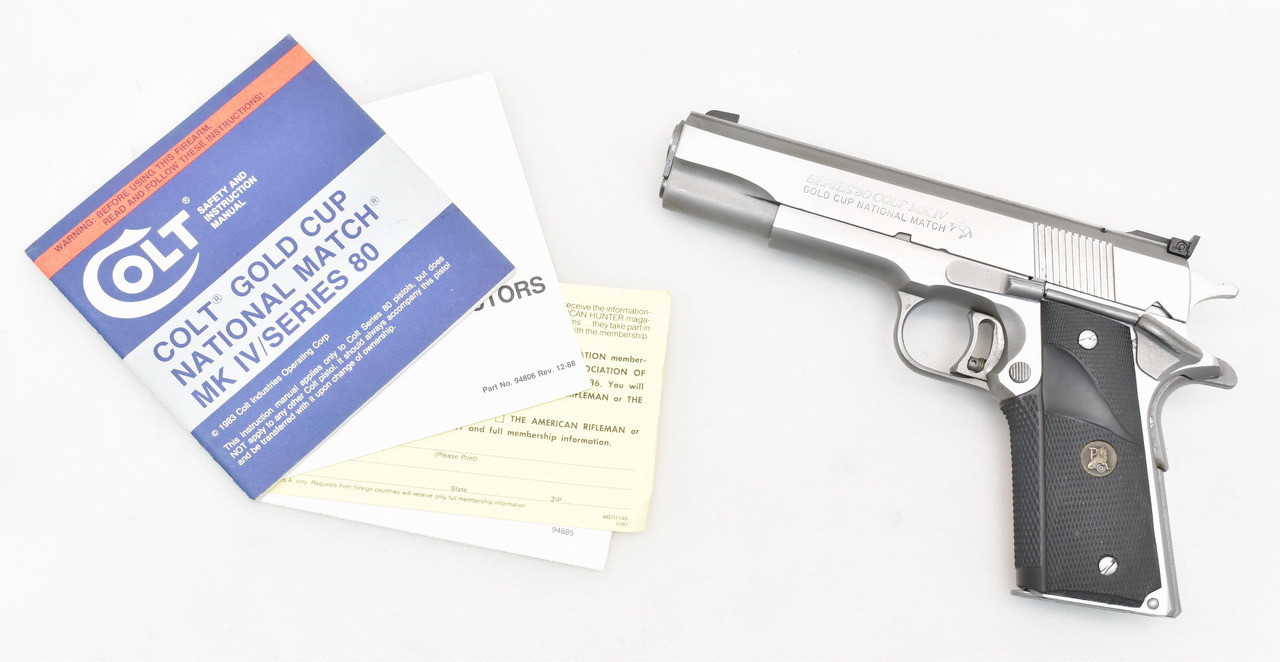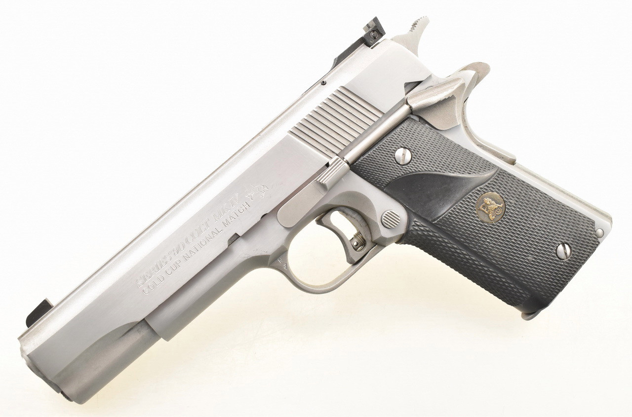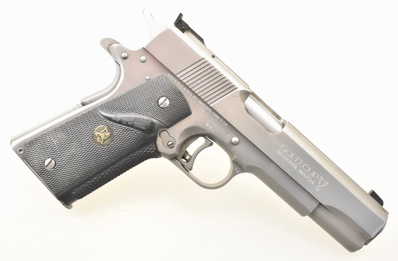 Gebrauchte Stainless - Steel Pistole Modell 1911 MK IV der Serie ´80 " Gold Cup National Match " des bekannten amerikanischen Herstellers COLT. Spiegelblanker Lauf. Kölner Beschuß 1988. Kettner Vertriebsstempel. Höhen- und seitenverstellbare " Elliason " Visierung. Balkenkorn. 167mm langer Visierlinie. Abzug mit Triggerstop. Pachmayr Signature Gummigriffschale mit Fischhautmuster.