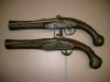 Verkaufe zwei alte Steinschlosspistolen. Bei einer ist der Schaft beschädigt. Länge je ca. 40cm - recht schwer.