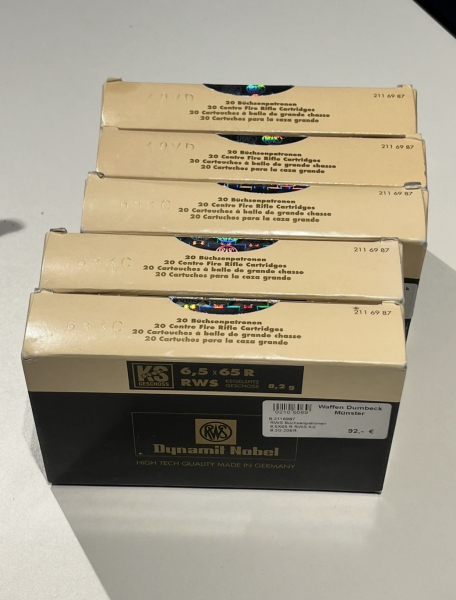 Zum Verkauf steht ein Konglomerat aus insgesamt 131 Schuss 6,5x65R RES bestehend aus 100 Schuss RWS Kegelspitz Geschoss KS im Kaliber 6,5x65R RWS 9,2 g mit zwei Losnummern einmal 60 Schuss und einmal 40 Schuss je Losnummer. Sowie professionell geladene 6,5x65R RWS mit Accubond 130 grain Geschoss insgesamt 31Schuss. Wegen den aktuellen Gesetzesbestimmungen erfolgt der Verkauf unter Ausschluss jeglicher Gewährleistung, Garantie und Rücknahme. Da es sich um einen Privatverkauf handelt kann ich keine Gewährleistung nach neuem EU-Recht übernehmen. Der Käufer erklärt sich damit einverstanden und erkennt dies mit seinem Kauf an. Bei Fragen bitte melden. Kein internationalem Versand. Am liebsten wäre mir eine persönliche Abholung.