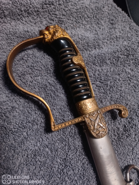 Alter Löwenkopf Säbel, Rote Steine in den Augen, ohne Hersteller, schöne Eichenlaub Verzierung.