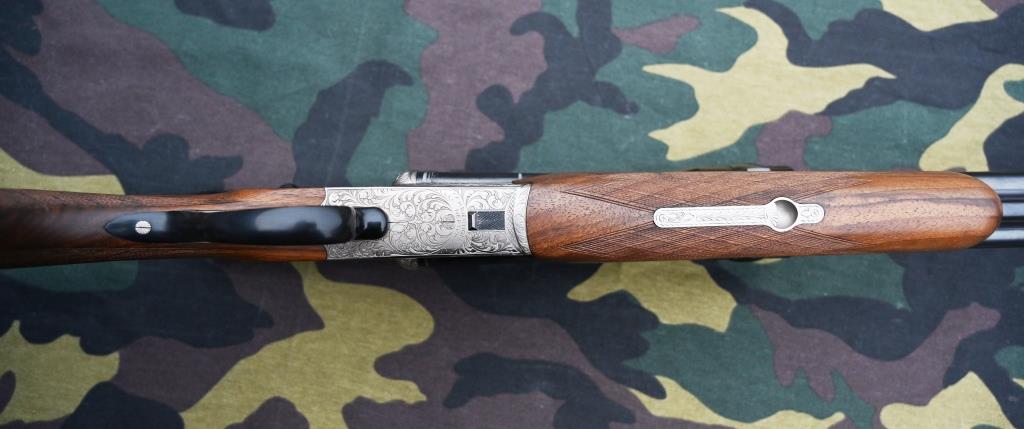 Doppelabzug, automatische Kolbenhalssicherung, Auszieher (kein Ejektor), doppelte Laufhakenverriegelung und Schienenverlängerung mit Greener, rundum floral gravierte Basküle aus Stahl, mit Rosetten- und Ornamentgravur, links und rechts auf den abnehmbaren Seitenplatten mit allerlei Rotwild-Darstellungen.