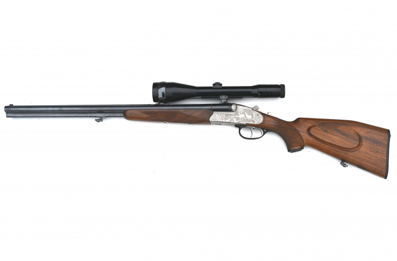 Jagdgewehr, Drilling, Kombinationswaffe, Dreiläufer mit Handspannung für den Kugellauf, herausnehmbaren Seitenschlössern, einstellbarem Rückstecher, Auszieher, Umschaltung links oben auf dem Kolbenhals und Ölschaft.