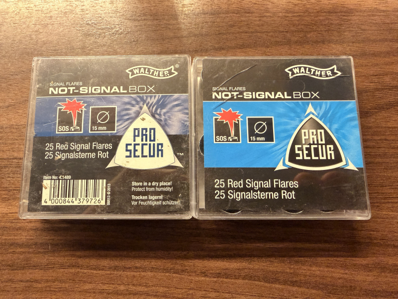 Aus meiner Sammlung zwei verschiedene Packungen Walther Seenotsignale für Schreckschusswaffen im Kaliber 15mm. Die Signalsterne sind schon etwas älter und enthalten noch eine sehr gute Ladung an Brennstoff. Sehr helle, rote Signal Leuchtsterne, mit sehr langer Brenndauer um in einer Notsituation auf sich aufmerksam zu machen. Dies könnte einem beim Wandern, Bergsteigen oder auf hoher See eventuell das Leben retten. Die Notsignale haben eine hellere Leuchtkraft und längere Brenndauer als normale Zinksterne, so bekommt man mit der richtigen Schreckschusswaffe, Munition und Abschussbecher die maximale Steighöhe und somit das effektivste Notsignal, dass man in Deutschland frei erwerben kann. Versende nach Zahlungseingang. Da Privatverkauf, keine Garantie auf Funktion oder Rücknahme. Verkauf unter Ausschluss jeglicher Sachmängelhaftung. Alle Angaben nach bestem Wissen und Gewissen.