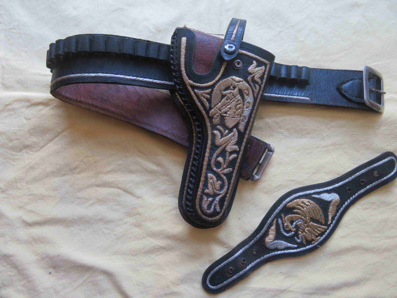 Angeboten wird ein antikes mexikanisches Holster mit Gürtel. Die Schlaufen des Gürtels sind für Patronen kleineren Kalibers ausgerichtet. Gürtel und Holster sind mit feinem Gold und Silberdraht /Fäden bestickt. 1 A Zustand mit geringfügigen altersbedingten Gebrauchsspuren. -keine Gewährleistung und keine Rücknahme-