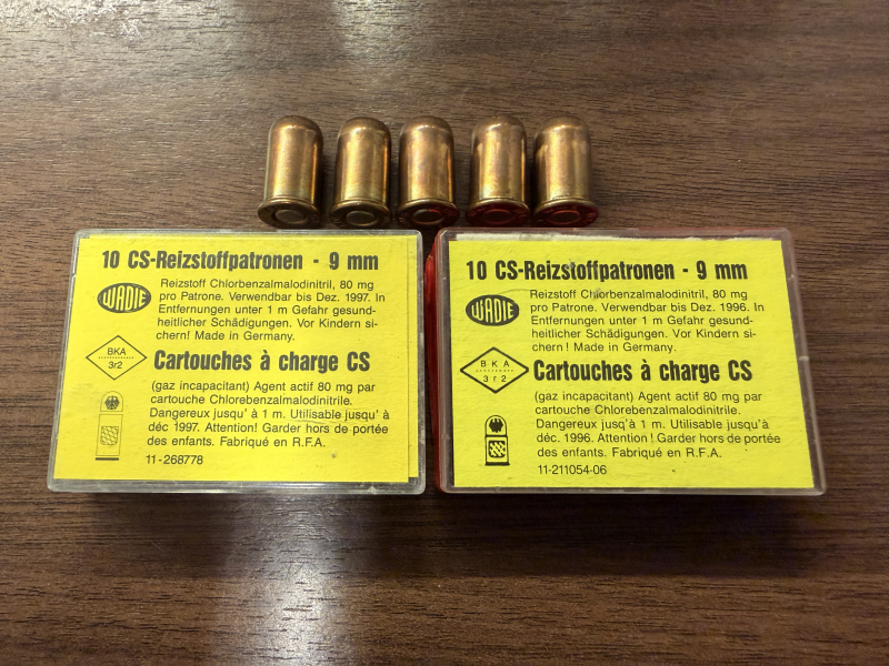 Verkaufe aus meiner Sammlung: 25 Wadi CS Gas Kartuschen im Kaliber 9mm R Knall. Es handelt sich um Sammler Munition von 1997/1996 die noch extrem stark geladen ist. Aus meinem HW88 hat diese Munition dennoch hervorragend gezündet und mit einem sehr lauten Knall, eine beeindruckende Gaswolke hinterlassen. Diese CS Abwehrmunition ist mit dem sehr sauber abbrennbarem NC Pulver (Nitrozellulose) geladen, was Verschmutzungen und Ladehemmungen vorbeugt. Jede Kartusche enthält 80mg Chlorbenzalmalondinitril (CS Gas) welches in Deutschland zur Selbstverteidigung gegen Menschen zugelassen ist. Dies bestätigt auch das BKA Prüfsiegel (3r2) in Raute. Eine sehr wirkungsstarke Patrone, die ich auf jeden Fall zur Selbstverteidigung sehr empfehlen kann. Versende nach Zahlungseingang, da Privatverkauf, keine Garantie oder Rücknahme. Verkauf unter Ausschluss jeglicher Sachmängelhaftung. Alle Angaben nach bestem Wissen und Gewissen.