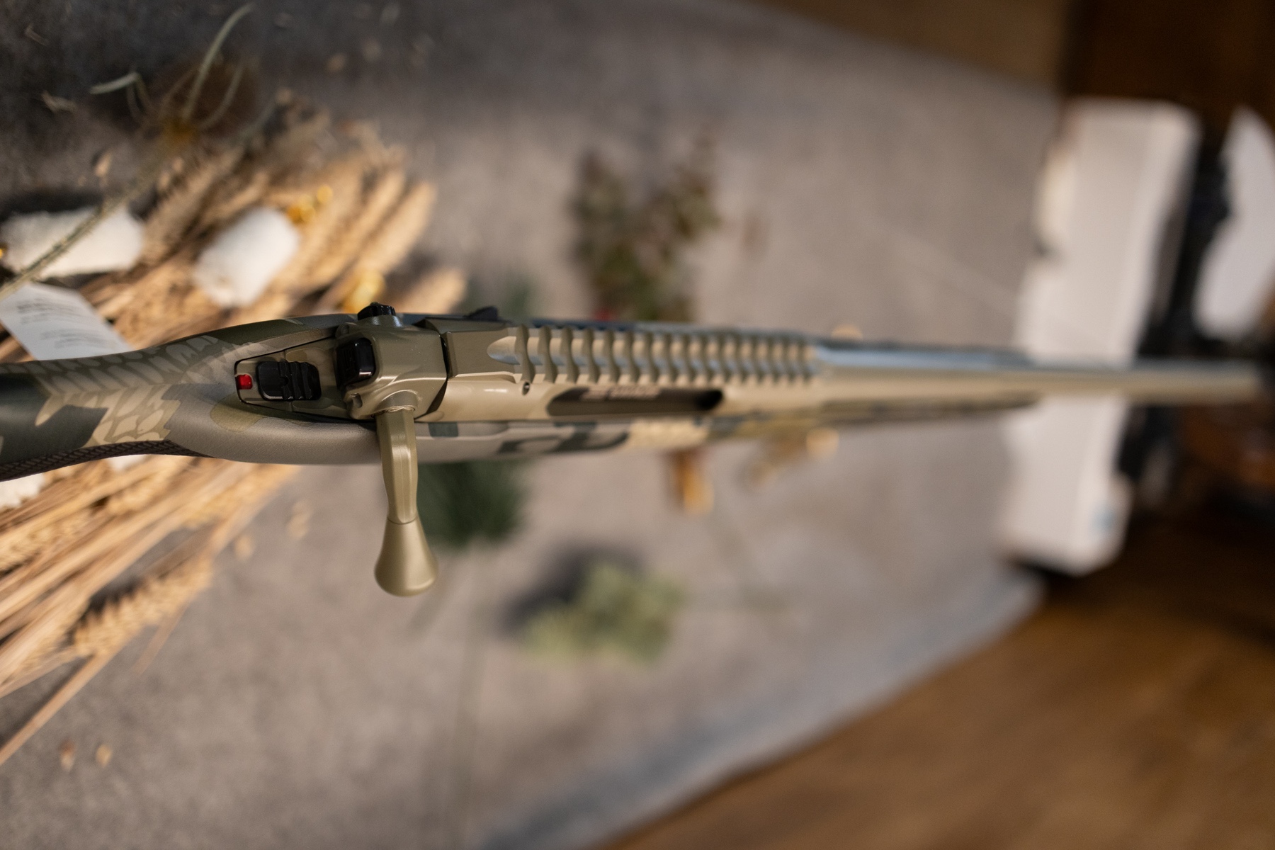 Zusätzliche Informationen: Neuwaffe, einstellbarer Abzug, Picantinny Schiene 20MOA, automatische Kammersperre, Cerakote Beschictung Hazel Green, Geradezugrepetierer