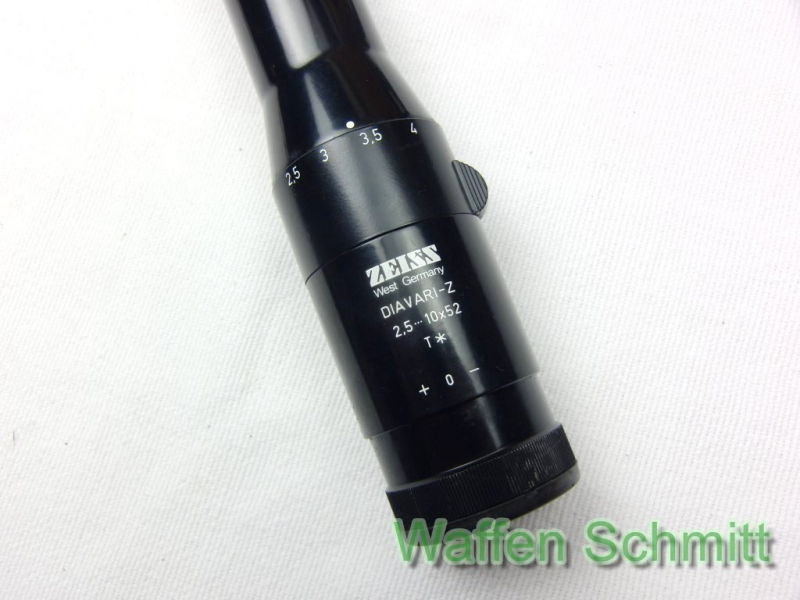 Sie bieten auf ein Zielfernrohr Zeiss Diavari-Z 2,5-10x52, Abs.1. Vollschiene am Mittelrohr, keine Kratzer auf den Linsen, Gebrauchsspuren am Mittelrohr von der Montage, einwandfreie Funktion. Guter Zustand!!!