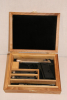 Die Kassette ist mit schwarzem Samt gepolstert mit einem Fach für eine Pistole Walther PP sowie zwei Magazinen und ein Fach für Putzbürste und Abschußbecher.