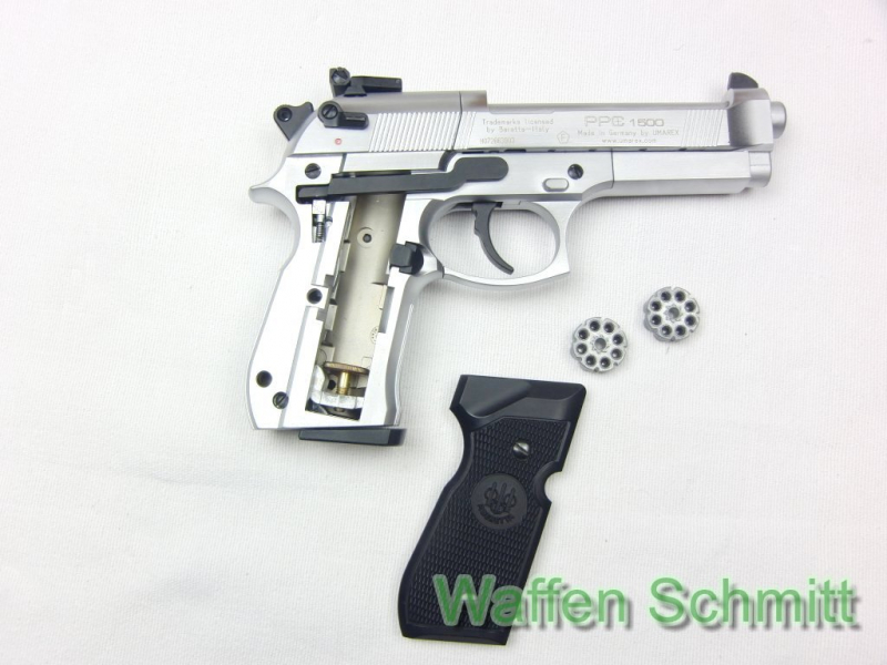 Sie bieten auf eine CO2 Pistole Beretta 92FS PPC 1500 im Kaliber 4,5mm Diabolo. F-Ausführung. Matt-Finish Ausführung mit 115mm Lauflänge und verstellbarer Visierung, gezogener Lauf, Double Action Funktion, beidseitige Flügelsicherung, 8-Schuß Trommelmagazin inklusive Reservemagazin, schwarze Kunststoff-Griffschalen. Gesamtlänge 210mm, Gesamtgewicht 1260gr. Antrieb durch 12gr. CO2 Kapseln. Einwandfreie Funktion. Im Originalkoffer mit Bedienungsanleitung und Diabolos. Sehr guter Zustand!!!