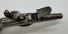 Es gibt drei Mängel: die Schlagfeder fehlt (der Hahn lässt sich spannen, aber nicht mit Schwung abschlagen), eine untere Schaube am Kasten fehlt, und die Schraube zum Fixieren des Abzugbügels lässt sich nicht mehr stramm festziehen (hier auch eine winzige Fehlstelle in der Wandung). Ansonsten sind sie Spaltmaße des verlöteten Ganzmetallgriffes natürlich altersbedingt, siehe auch die Fotos..