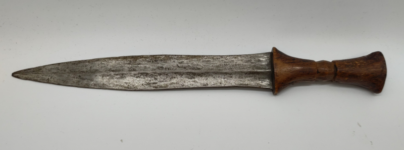 Biete hier einen alten, afrikanischen Dolch an. Der Griff ist aus Holz und die scharfe Klinge dünn aus Eisen (kalt-?) geschmiedet. Länge ca. 29 cm.