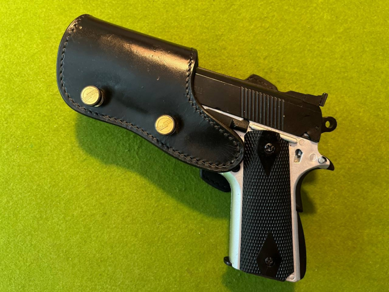 ganz schnell und ohne Werkzeug auf vielen ähnlichen Waffen anderer Hersteller einstellbar. Der Körper besteht aus einem einzigen, dicken 2-lagigen Lederstück, und hat 2 inneren Führungsschienen über den Lauf der Waffe; der auf 2 Winkel umstellbarer Steg ist innen mit Stahlblech verstärkt. Das Holster ist insgesamt aufwendig und hochwertig gefertigt.