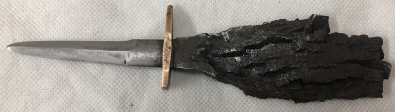 Sie bieten auf einen kleinen Dolch / Brieföffner. Es handelt sich um eine originale, handgefertigte Frontarbeit aus dem ersten oder zweiten Weltkrieg. Die Klinge besteht, wie der Griff, aus einem Granatsplitter mit einer Parierstange aus Messing. Insgesamt ein schönes, originales Stück Zeitgeschichte.