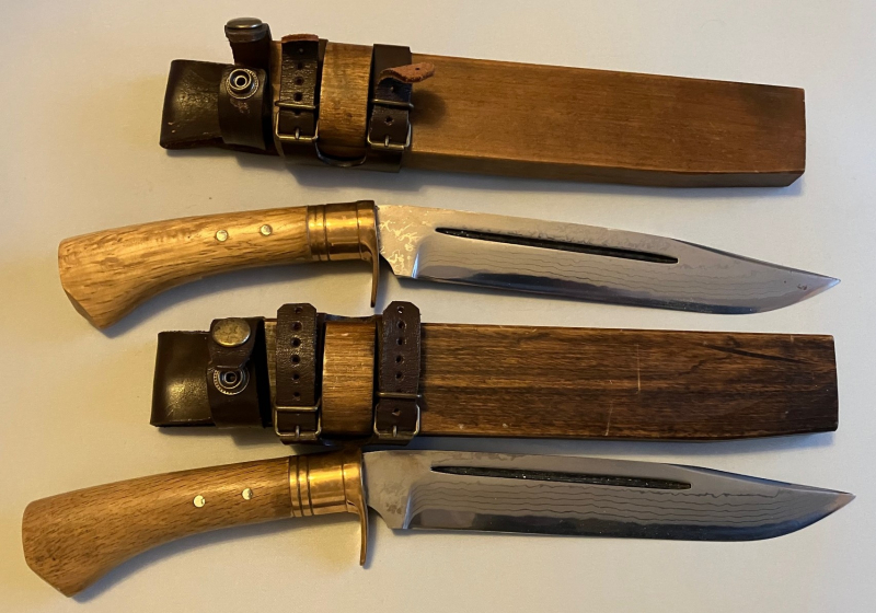 2 Stück Outdoormesser Jagdmesser, Damaststahl, 21,5 cm Klingenlänge, 35 cm Gesamtlänge des Messers. Privatverkauf im Auftrag eines Freundes. Gebrauchs- und Lagerspuren siehe Bilder.