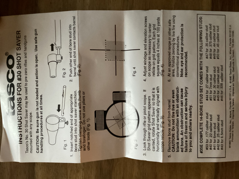 Ein Tasco No. 30 Shot Saver ist ein sogenannter Boresighter (Kollimator). Sein Hauptzweck ist es, ein Zielfernrohr auf eine Waffe auszurichten, ohne dabei teure Munition zu verschwenden.