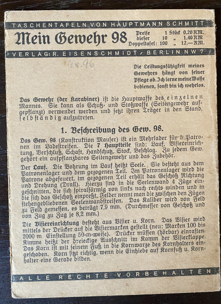 Zum Verkauf steht meine original „Mein Gewehr 98“ Taschenkarte. Es sind alle Seiten bedruckt. Es hat Gebrauchsspuren, ist ja auch nicht mehr ganz neu. Da ich mich seit geraumer Zeit von Ordonnanzgewehren zurückziehe, kommen heute die verbliebenen Original Taschenkarten den Tag über noch zum Verkauf. Keine Garantie oder Rücknahme, bei Versand ins Ausland bitte Portokosten erfragen. Versand per Einschreiben, bei Mehrfachkäufen gerne als versichertes Paket.