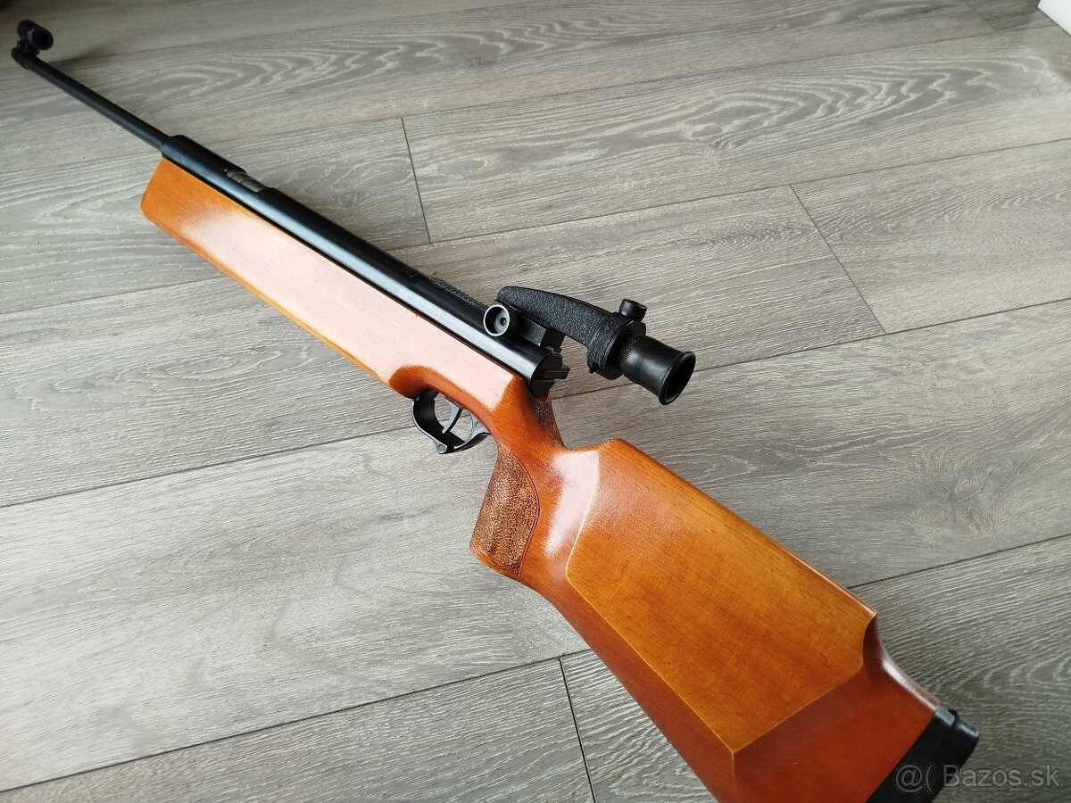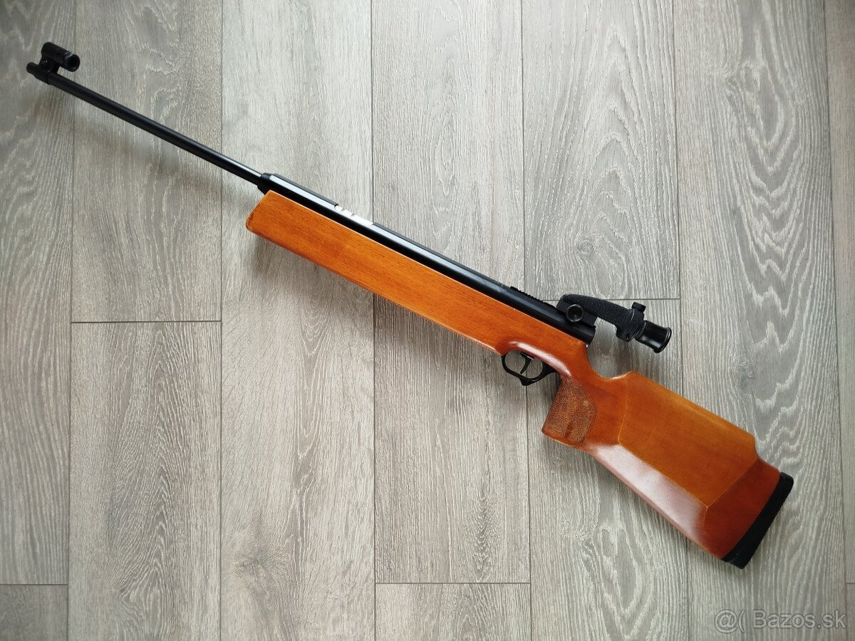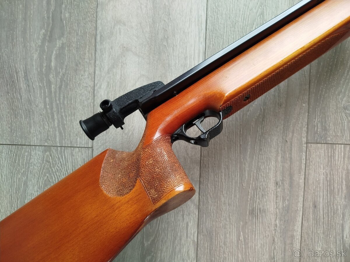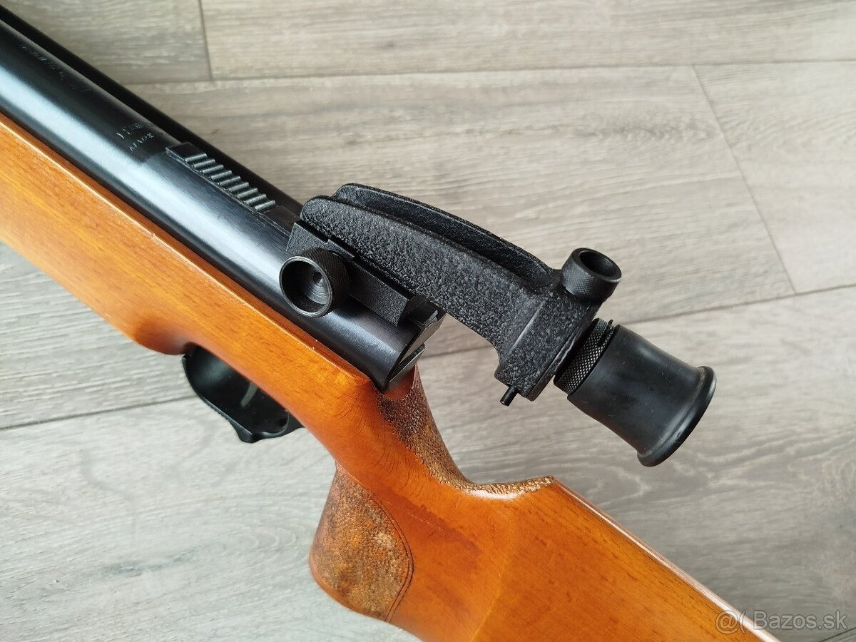 Einzellader Seitenspanner Luftgewehr, mit starrem Lauf, Prellschlag Redukzion, Match Abzug. Kaliber 4.5 mm, Lauf gezogen, Länge 1070 mm, Gewicht ca. 4.5 Kg. Schussleistung 165 m/s.
