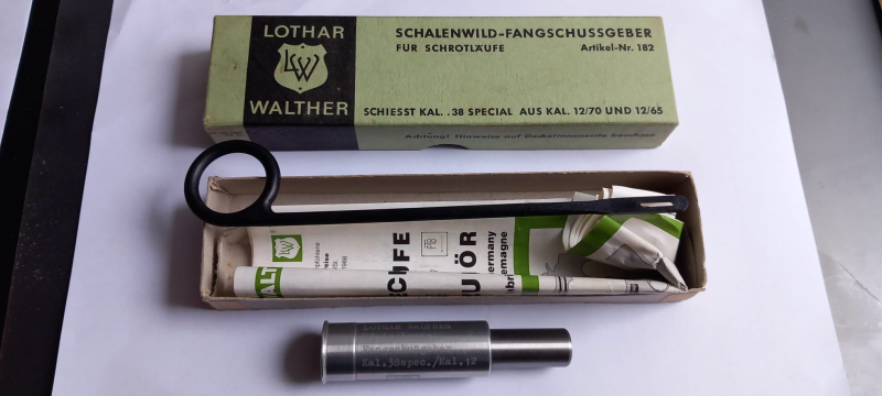 Lothar Walter Schalenwild Fangschußgeber Kal. 12/70 auf .38 Spezial.mit Putzstock u. Anleitung, ca.90 mm lang, unbenutzt. Dürfte in diesem Zustand, (neuwertig), kaum mehr zu bekommen sein. Wird nicht mehr hergestellt.