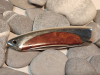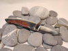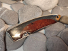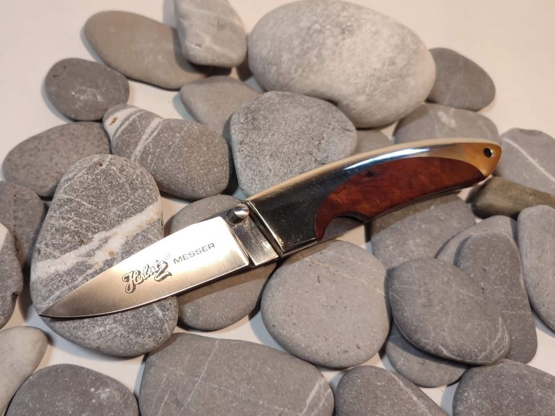 Schöne Griffschalen aus Pakkaholz (?) mit Edelstahl. Die feststellbare Klinge besteht aus rostfreien ATS 34 Stahl.