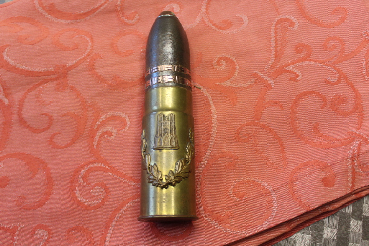 Sehr schönes Stück. Glaube zu wissen das diese Patronen nach dem WKI in Frankreich verkauft wurden um mit dem Erlös die Restaurierung der Kathedrale von Reims zu unterstützen. Der Zünder ist ausgebohrt und mit Harz gefüllt das Geschoss hat am Boden ein Loch. Natürlich frei von allen gefährlichen Stoffen, rein Deko. Porto EU = 12,50€