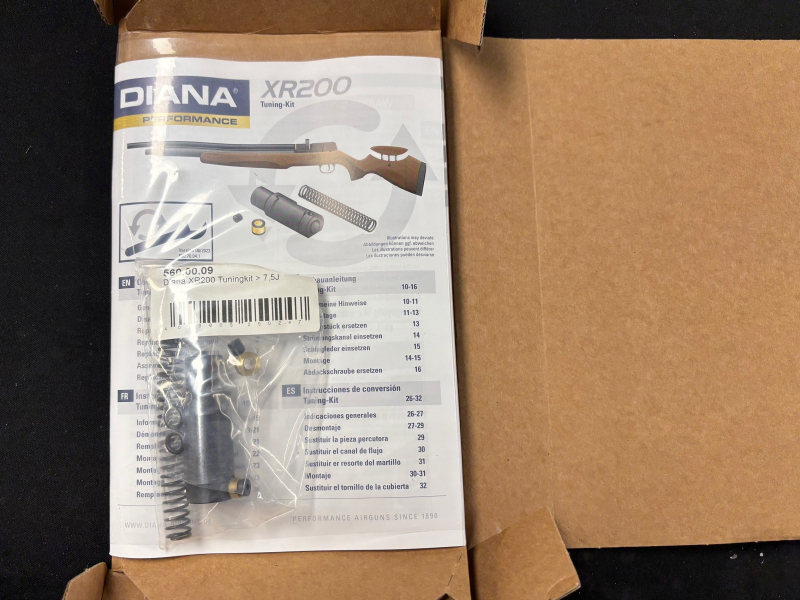 Verkaufe einen originalen Tuning-Kit für die Diana XR 200. Angeblich für alle Kaliber geeignet. Ob dieser auch in das neuere Modell XR 220 passt bitte selbst prüfen. Ursprünglich vorgesehen zur Leistungssteigerung für ein Fieldtarget-Projekt (Klasse 1) kam das Set nie zum Einsatz und wird daher verkauft. Neben den Einbauteilen gibt es eine detaillierte Einbauanleitung in Deutsch. Verkauft wird, was auf den Fotos zu sehen ist.