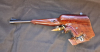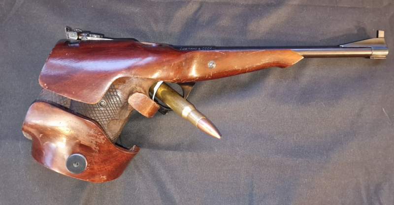 Die Pistole verfügt über einen modifizierten Martini-Verschluss und zeichnet sich durch markante, großflächige Holzgriffe aus, die bis zur Oberkante des Laufs reichen.
