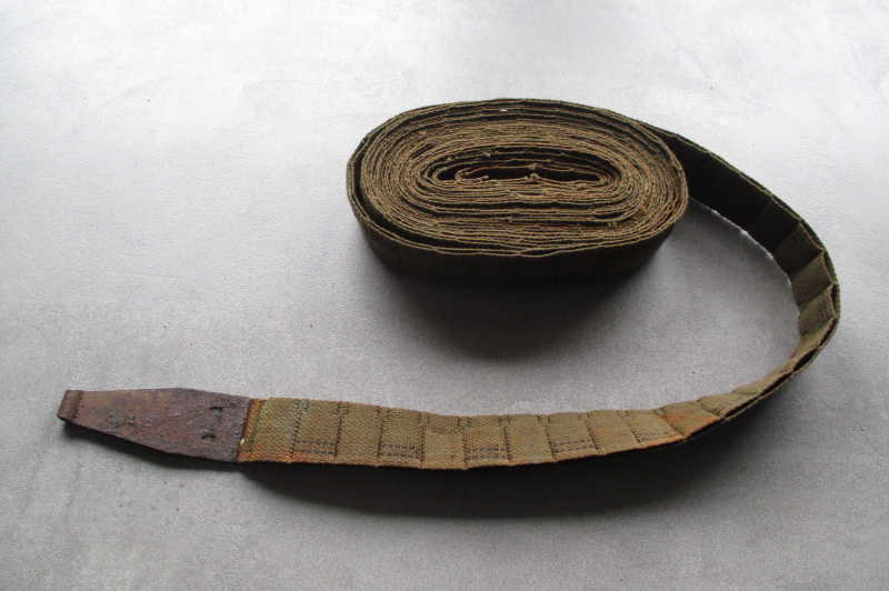 Biete hier aus Sammlungsauflösung einen schönen und originalen MG-Gurt aus Stoff für das US Maschinengewehr Browning M1919 A4 aus dem 2.WK in der Farbe grün an. Es handelt sich um einen Webgurt für 250 Schuss Cal. 30-06, der in einer Munitionskiste aus Blech eingelegt war. Stempel von 1943. Zustand gebraucht, leicht fleckig und etwas rostig an dem Einführstück, ein Einführstück fehlt, siehe Fotos.